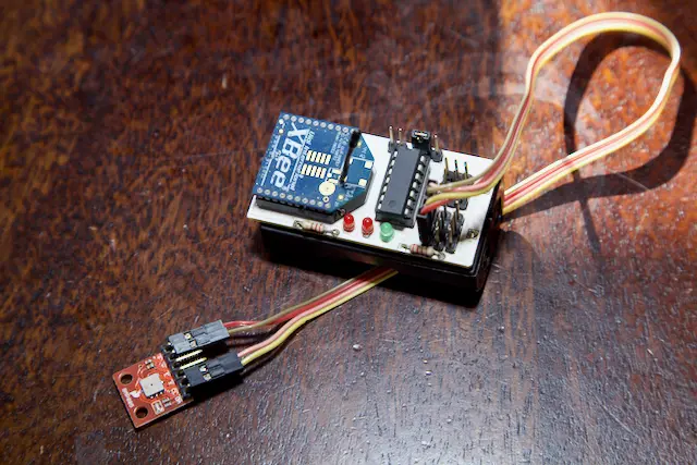 | Temp & Pressure | General I2C experimental node with BMP085 sensor measuring temperature and barometric pressure. Board design (Fritzing): XBeeSensor84_1.1.fzzCode: XBeeBMP085Sensor2.ino | ATTiny84 | BMP085 | 15 mins |